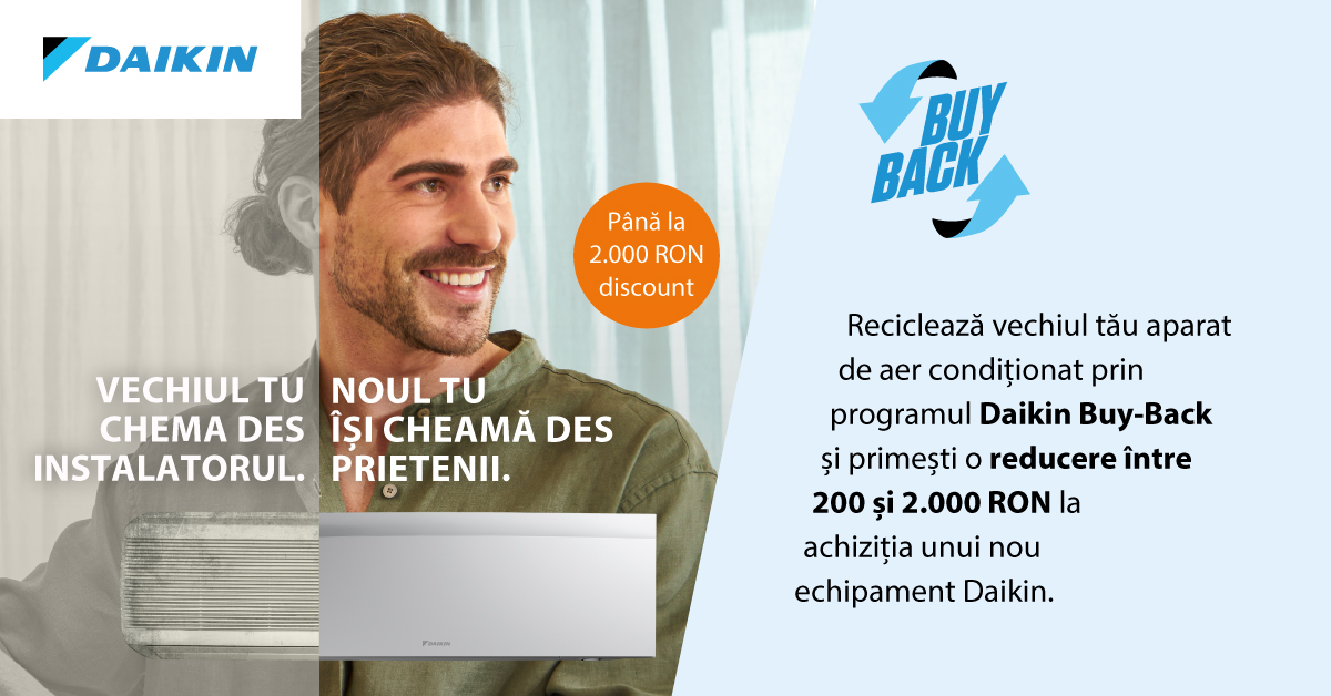 Dacă aparatul tău de aer condiționat face zgomot ca o râșniță de cafea, este timpul să renunți la el! Alege unul din modelele din programul BUY BACK și beneficiezi de o reducere pentru achiziționarea noului tău aparat Daikin.